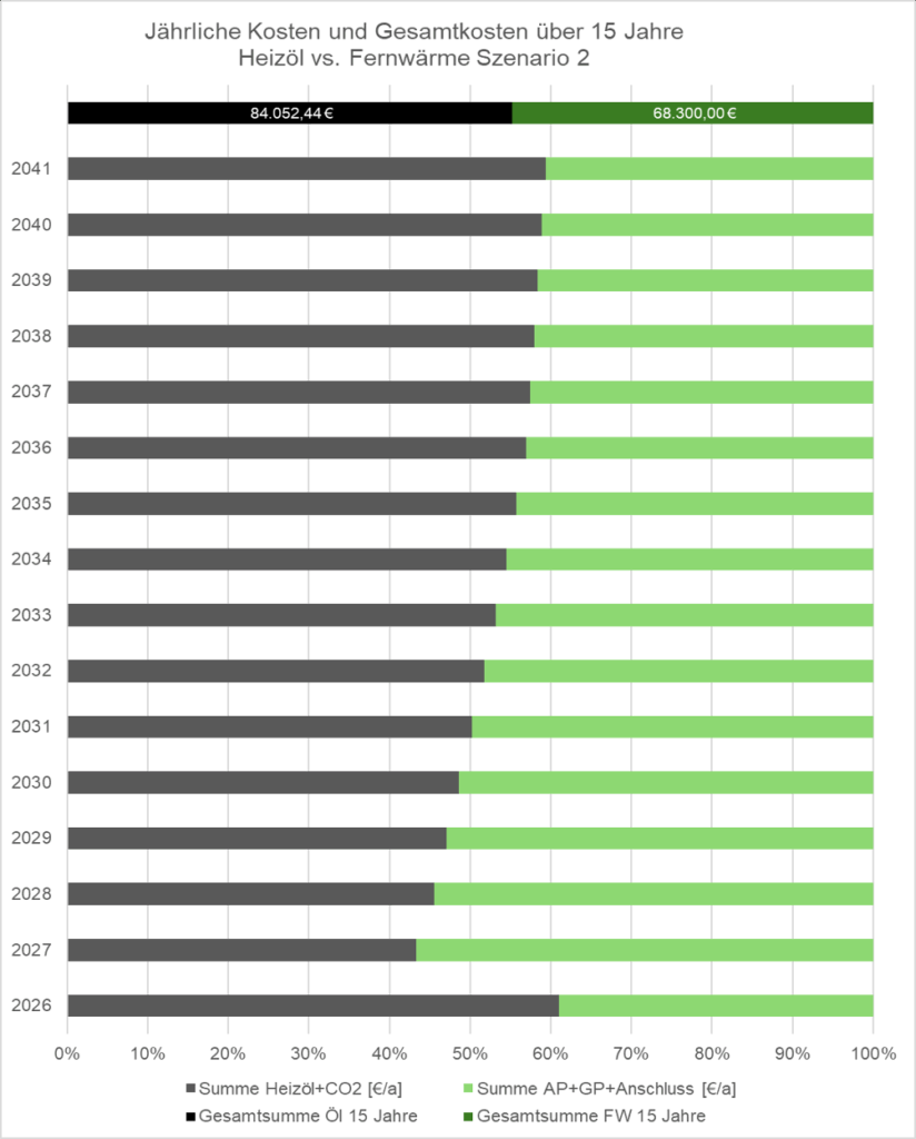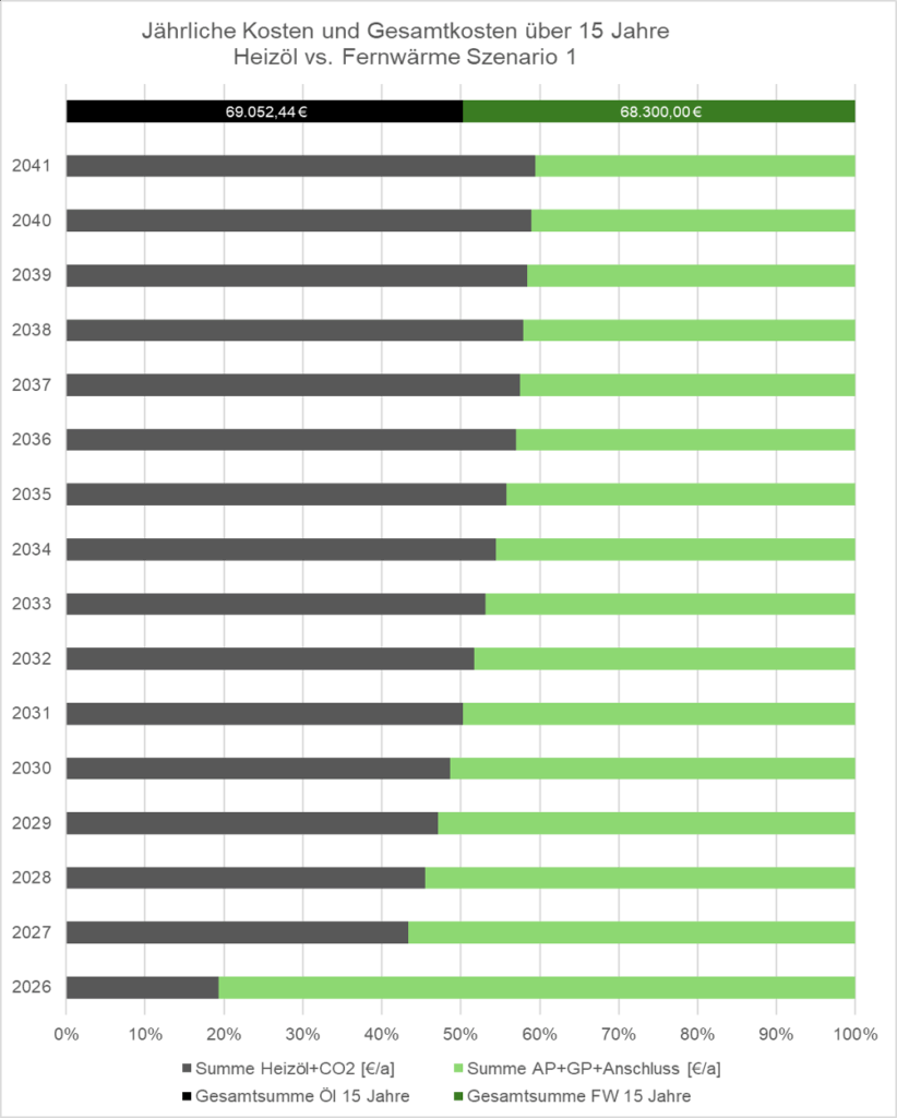 Im ersten Szenario wird angenommen, dass die aktuell bestehende Ölheizung die nächsten 15 Jahre weiterbetrieben wird. Im zweiten Szenario wird die Wirtschaftlichkeit eines Fernwärmeanschlusses mit einer neuen Ölheizung verglichen.