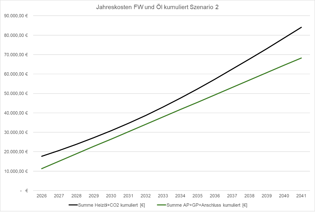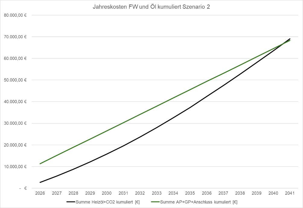 Szenario 2: Muss die Ölheizung innerhalb des Betrachtungszeitraums erneuert werden, kippt die Bilanz zugunsten des Wärmenetzes (bei angenommenen 15.000 € Austauschkosten in unserem Beispiel).
